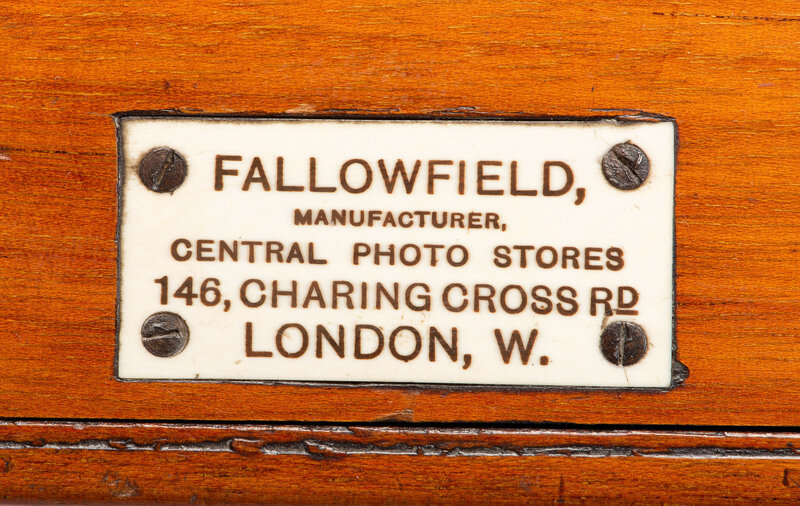 Mahogany sliding-box camera with carte de visite sliding back. Lens panel contains 9 lenses. Front flap shutter. Rack and pinion focus. Label on top, which reads, "Fallowfield, Manufacturers, Central Photo Stores, 146, Charing Cross Rd., London, W." 13 x 8 x 7 1/2 in. when extended.