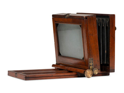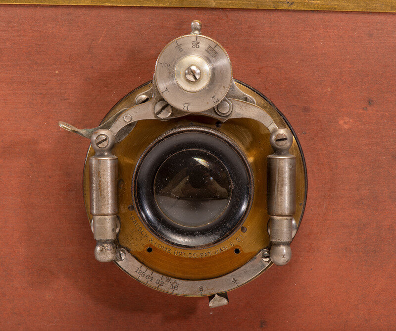 Genesee Outfit camera, 5 x 7 in. With bellows, Eureka back and double holder. The lens is marked "Bausch & Lomb Optical Co." 13 x 8 3/4 x 8 1/2 in.