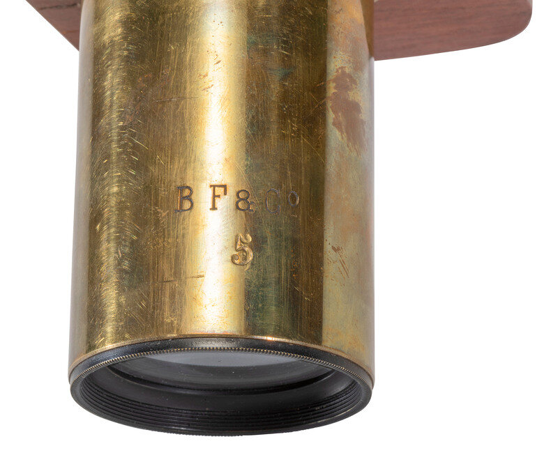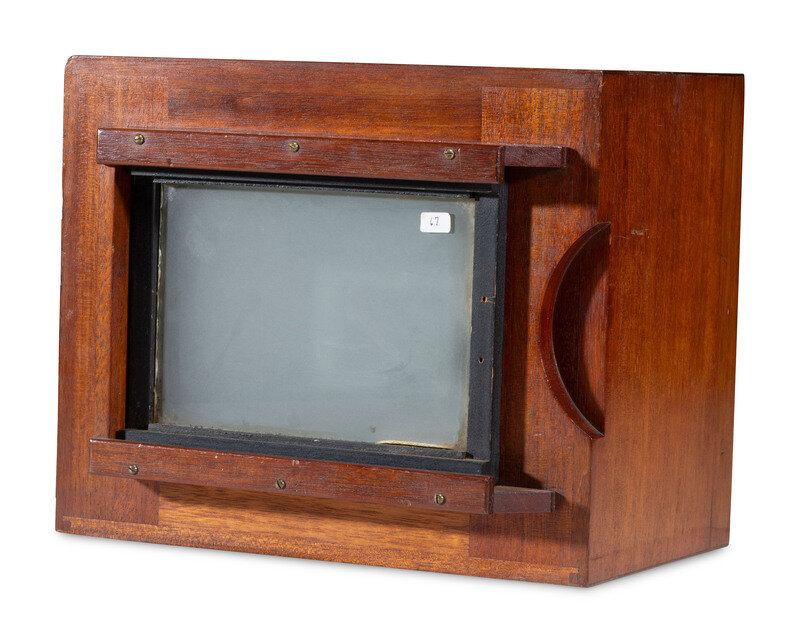 Wooden box-like camera, lens board slides vertically and horizontally, allowing to take up to 28 exposures on 5 x 7 in. dry plates. The lens is marked B F & Co. 12 x 9 1/2 x 7 in.