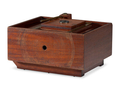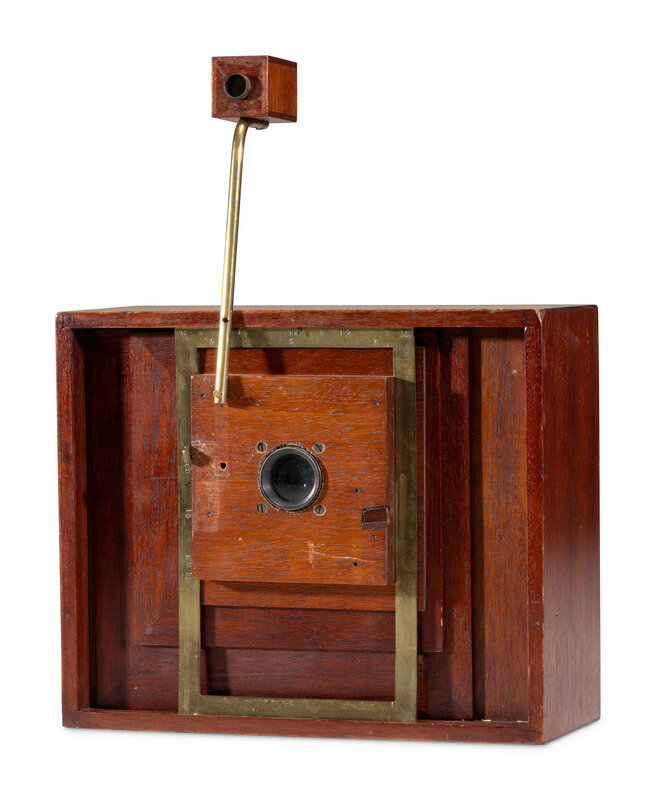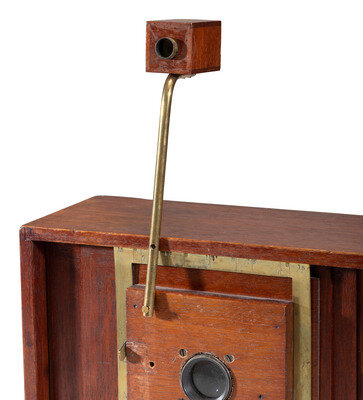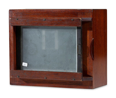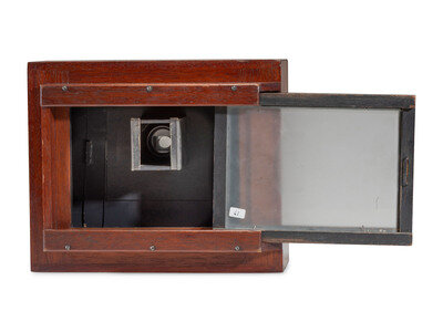 Wooden box-type camera, lens board slides vertically and horizontally, allowing to take up to 15 exposures on 5 x 7 in. dry plates. 10 1/2 x 8 3/4 x 5 1/2 in.