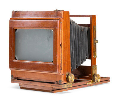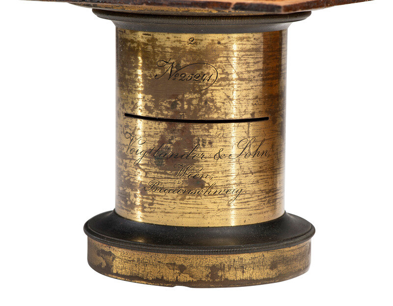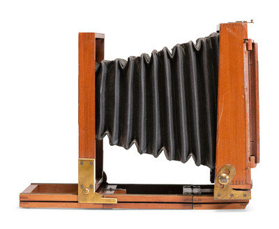 Folding field camera for plates of approx. 5 x 7 in. Mahogany body with decorated brass fittings, leather over canvas bellows. Lens is marked "Voightlander & John," No. 25241. 14 1/2 x 11 3/4 x 10 in.