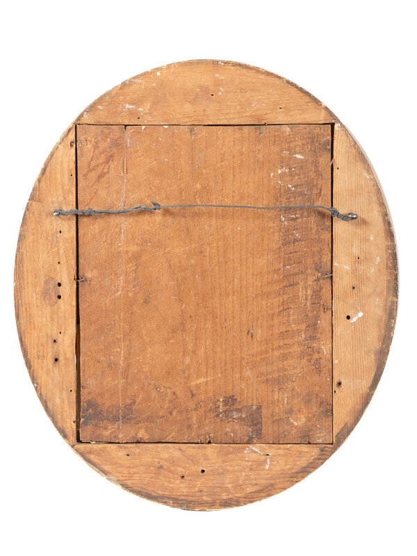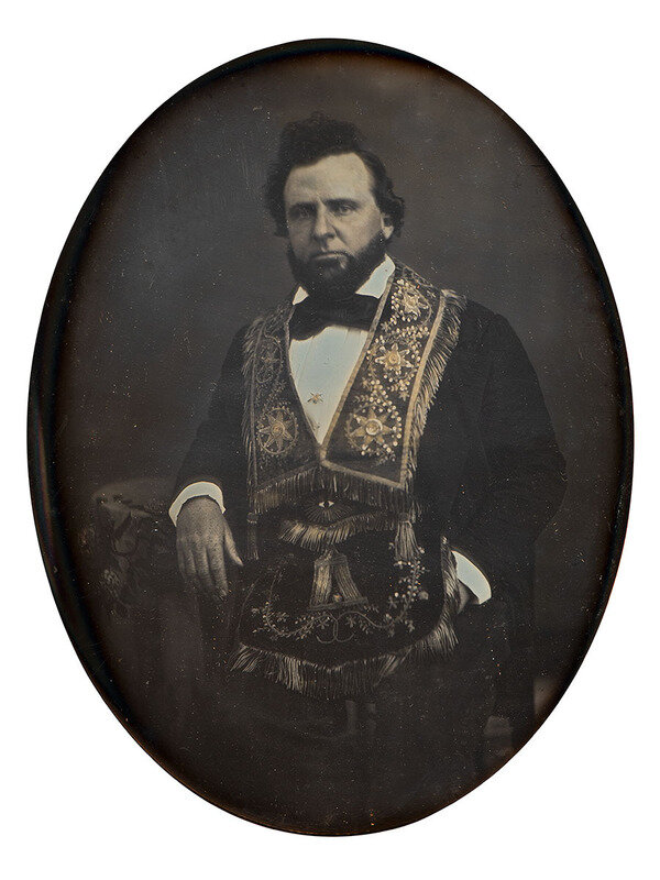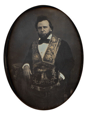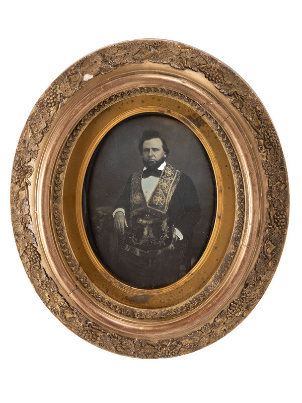 A striking daguerreotype portrait of a gentleman with thick beard and wavy locks, presented here in masonic regalia including fringed vestment and apron. 6 x 8 in. (sight), housed in an ornately gold-painted oval frame. (Tarnishing to edges, some minor surface imperfections, retains clarity; oxidation spotting to mat; unexamined out of the frame.)