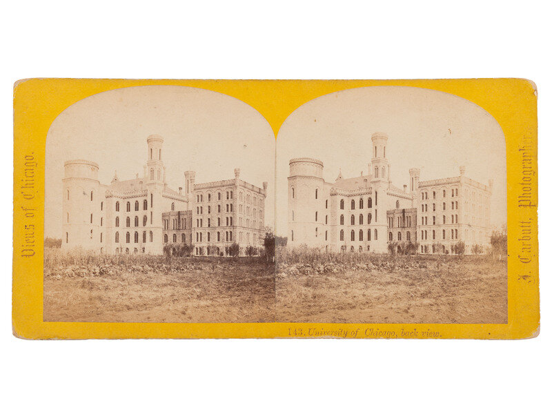 [With:] Stereoview titled "143. University of Chicago, back view," with John Carbutt's imprint and series title "Views of Chicago" on mount recto and faint pencil inscription reading, "Douglass Institute Chicago" on verso. Stephen A. Douglass donated the land upon which the university was built, and the university's Douglass Hall was named after his many contributions.