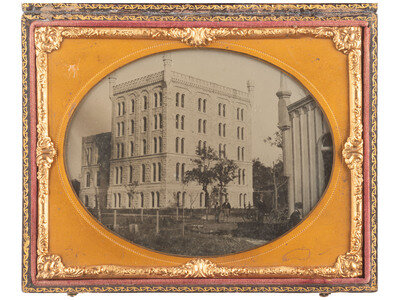 [EARLY PHOTOGRAPHY]. An early half plate ambrotype of the Old University of Chicago. Ca late 1850s.