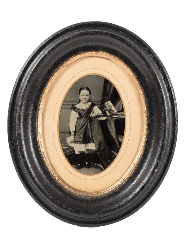 An delightfully endearing tintype portrait of a young girl with an apparent interest in photographic viewing. 4 x 6 in. (sight), housed in a black and gilt wooden frame. (Image exceptionally clear and sharp; not examined out of the frame.)