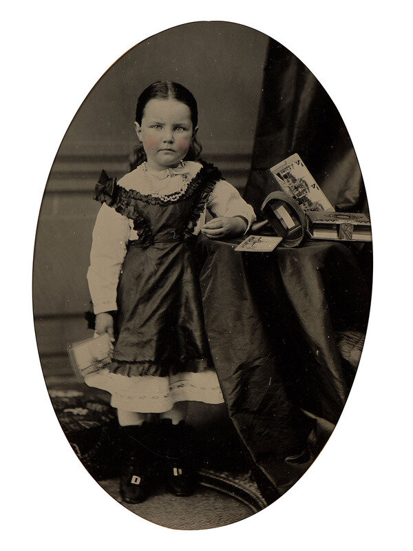 [EARLY PHOTOGRAPHY]. Tintype portrait of a little girl posed with stereoviews, viewer, and photo album.