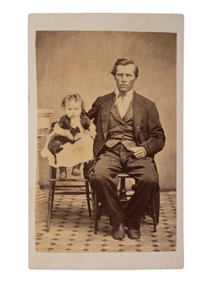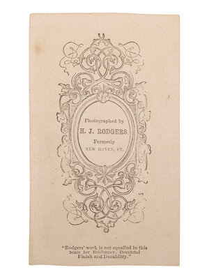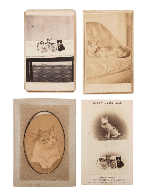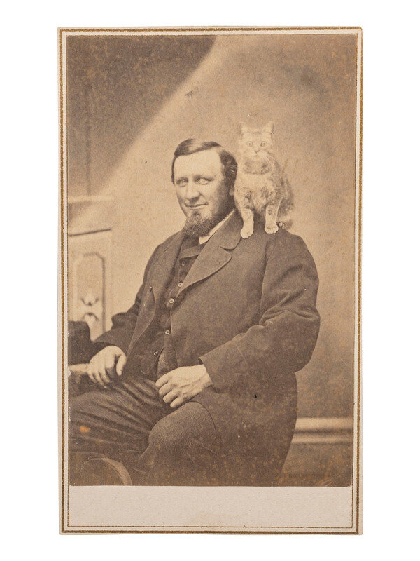 CDV portrait of a bearded man smiling wryly, having a cat perched atop his shoulder and looking directly into the camera (toning, spotting; trimming to mount edges). New Haven, CT: H. J. Rodgers, n.d. Rodgers's imprint on verso. -- CDV portrait of a man and a toddler-aged girl, likely his daughter, who holds a cat in her lap (toning; minor wear to mount edges). Uncredited. -- Composite CDV featuring vignetted portraits of a single cat and a group of cats entitled "Kitty Burnham and Family" (toning, spotting; light wear to mount). Boston: T. R. Burnham, n.d. Captioned and credited on mount recto. -- CDV portrait of a group of cat, unidentified but known from previous portrait to be "Kitty Burnham and Family," resting on an issue of The Boston Herald (toning, spotting; clipped mount corners). Boston: T. R. Burnham, n.d. Burnham's imprint on verso. -- Trimmed albumen portrait of a cat housed in a paper mat with oval opening (significant toning, some marking/spotting, abrasions, uneven trimming in an oval shape; mat toned and coming apart). Philadelphia: Broadbent & Phillips, n.d. Pictorial imprint to verso. -- CDV portrait of a cat resting on a covered couch or chair (significant toning, some spotting; minor discoloration/wear to mount). San Francisco: Bayley & Cramer's Fine-Art Gallery, n.d. Imprint to verso. -- Together, 6 portraits featuring cats.