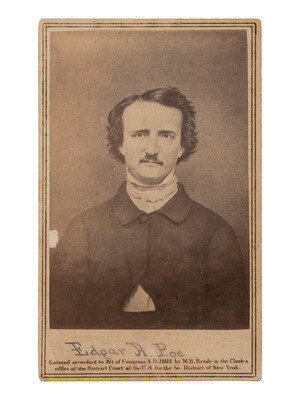 CDV portrait on cardstock mount with Brady's 1862 copyright beneath image and Anthony/Brady imprint on verso (small loss to left edge of print; mount with some toning and wear to edges/corners). Featured is a half portrait of Poe produced by Brady after a daguerreotype, likely a version of the one made by Edwin H. Manchester in November of 1948, also known as the "Ultima Thule" daguerreotype. Verso also bears affixed paper label for a stationery and fancy goods store in Baltimore.