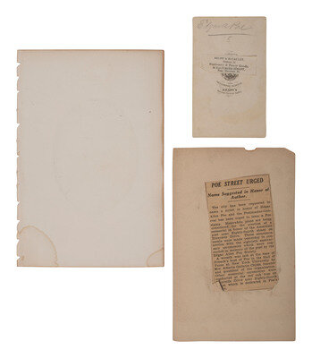 Cabinet card (toning, loss to upper edge and upper left corner, clipped edges) featuring an illustrated portrait of Poe titled beneath image, "Edgar Poe. / (The Memorial Portrait.)" Featured is an image of a portrait produced by Friederich Bruckmann, which was believed to be an altered derivative of the "Whitman" daguerreotype. Verso also bears affixed newspaper clipping about various plans to honor the memory of Poe, including naming a street, creating a stamp, and erecting a memorial.