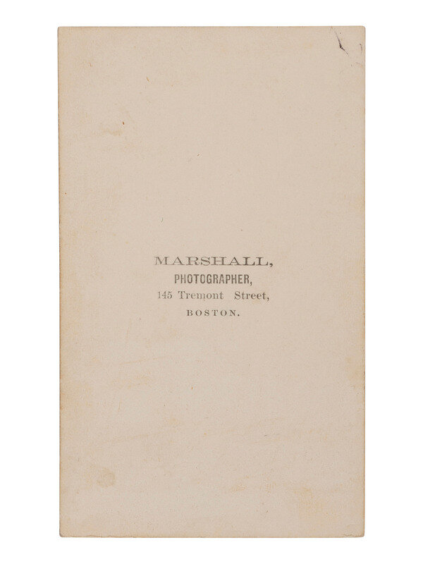 CDV vignetted bust portrait on cardstock mount with Marshall's imprint on verso and ink identification beneath image.