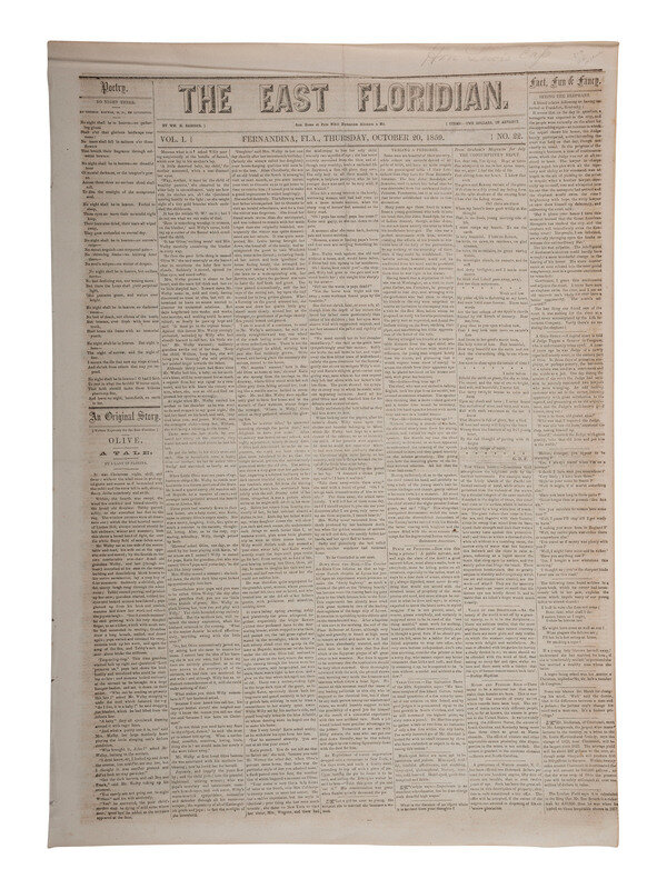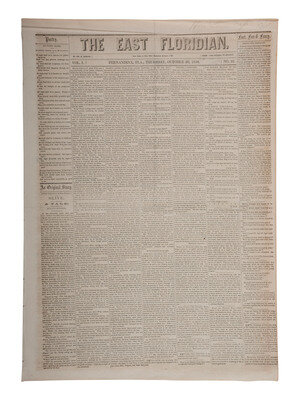 [ABOLITION]. John Brown's raid on Harpers Ferry reported in The East Floridian. Vol. I, No. 22. Fernandina, FL: Wm. H. Babcock, 20 October 1859.