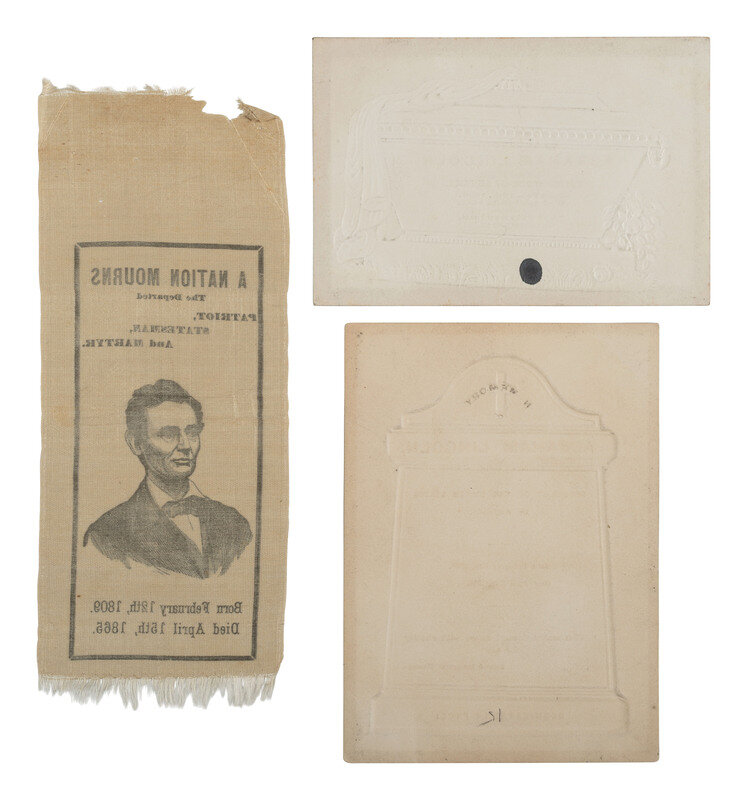 [LINCOLN FUNERAL]. A group of 3 items mourning the loss of Lincoln, incl. silk ribbon and printed cards.