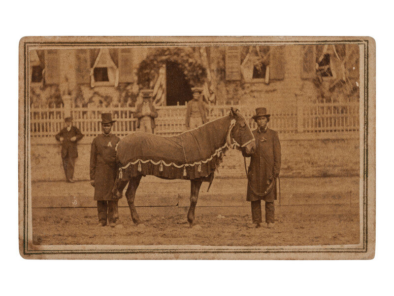 [LINCOLN, Abraham (1860-1865)]. CDV of Lincoln's Horse, "Old Robin" led by African American Reverend Henry Brown at the funeral. Springfield, IL: F.W. Ingmire, [4 May 1865].