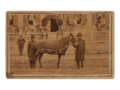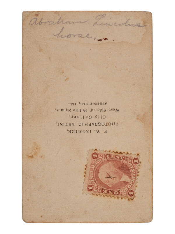 CDV on cardstock mount with F. W. Ingmire's imprint on verso along with 1-cent revenue stamp and penciled inscription, "Abraham Lincolns horse."