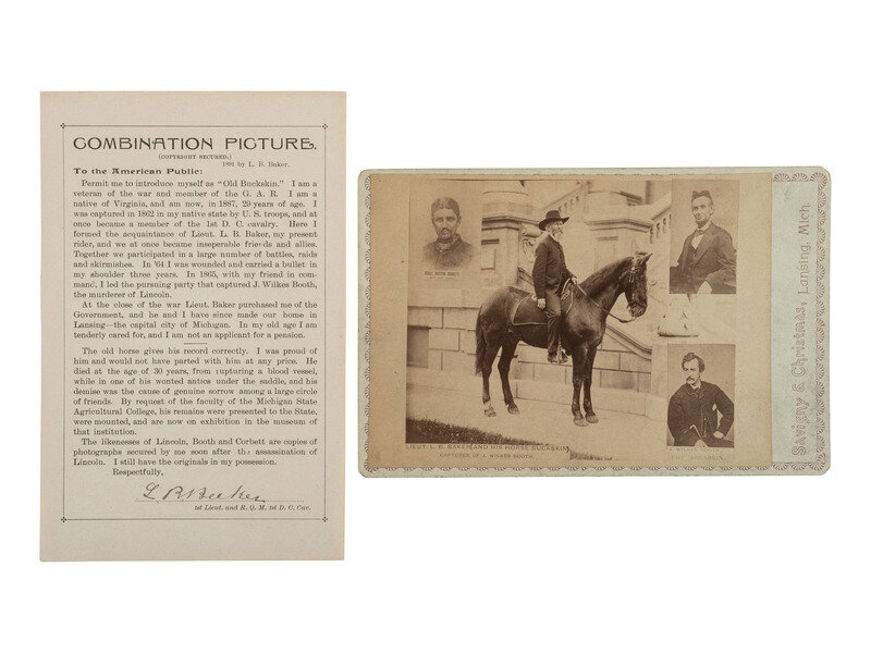 Lieut. L.B. Baker and his Horse Buckskin, capturer of J. Wilkes Booth. Lansing, MI: Savigny & Christmas, ca 1891. Cabinet card, composite image featuring Lieutenant Luther B. Baker mounted on his horse, Buckskin, at center, with photographs of Abraham Lincoln and John Wilkes Booth inset at right, and Boston Corbett inset at left. Accompanied by a printed "autobiography" written from the perspective of Baker's horse, "Buckskin," copyrighted 1891 and signed by L.B. Baker, 6 3/8 x 4 1/8 in. Originally issued with the cabinet card, the printed document notes that the likenesses of Lincoln, Booth and Corbett were copies of photographs secured by Baker soon after Lincoln's assassination.