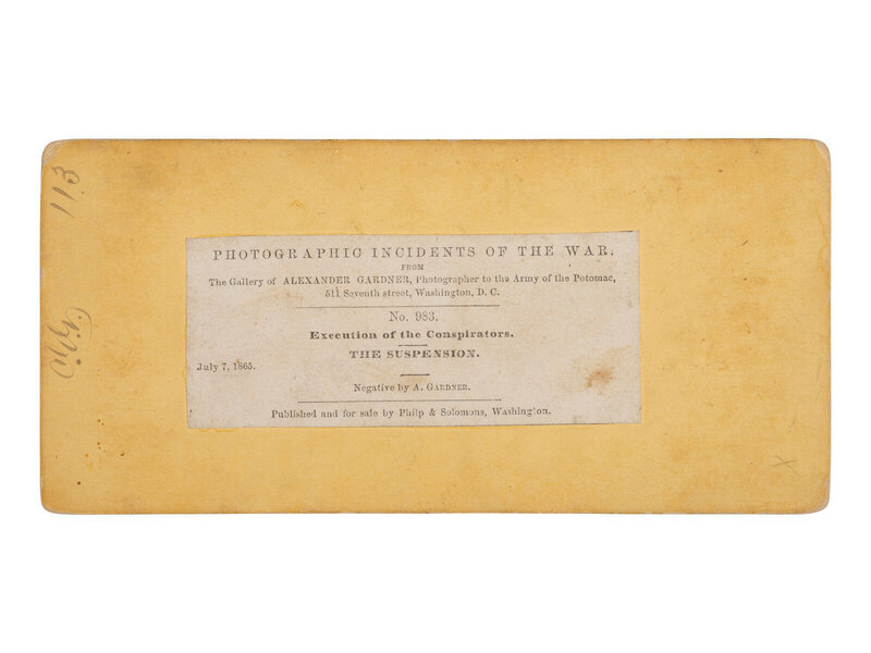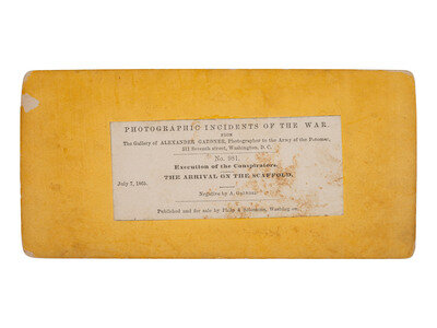 2 stereoviews on yellow mounts, each with Gardner's "Photographic Incidents of the War" paper label affixed to verso, bearing image number and title, including: No. 981. Execution of the Conspirators. THE ARRIVAL ON THE SCAFFOLD. -- No. 983. Execution of the Conspirators. THE SUSPENSION.