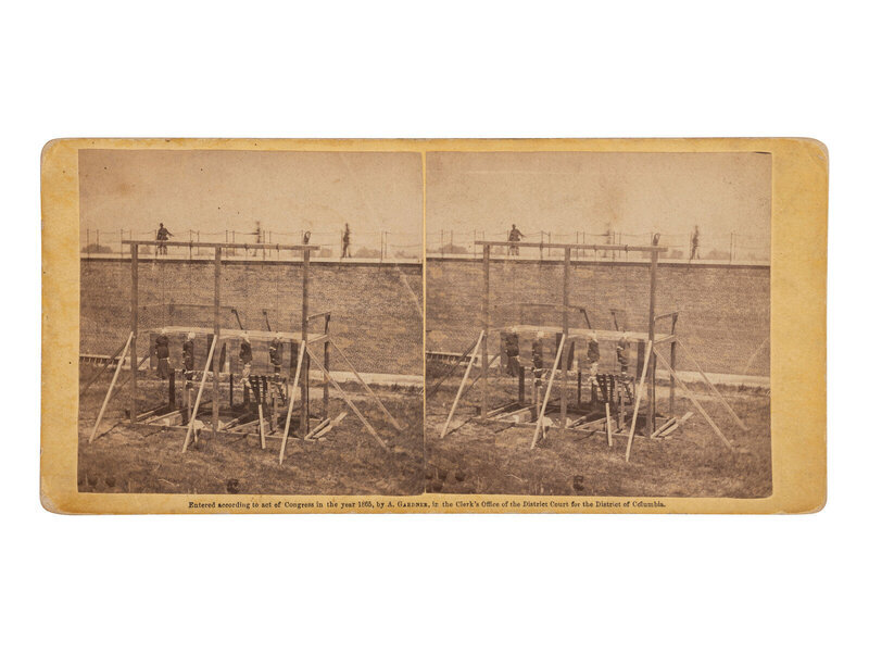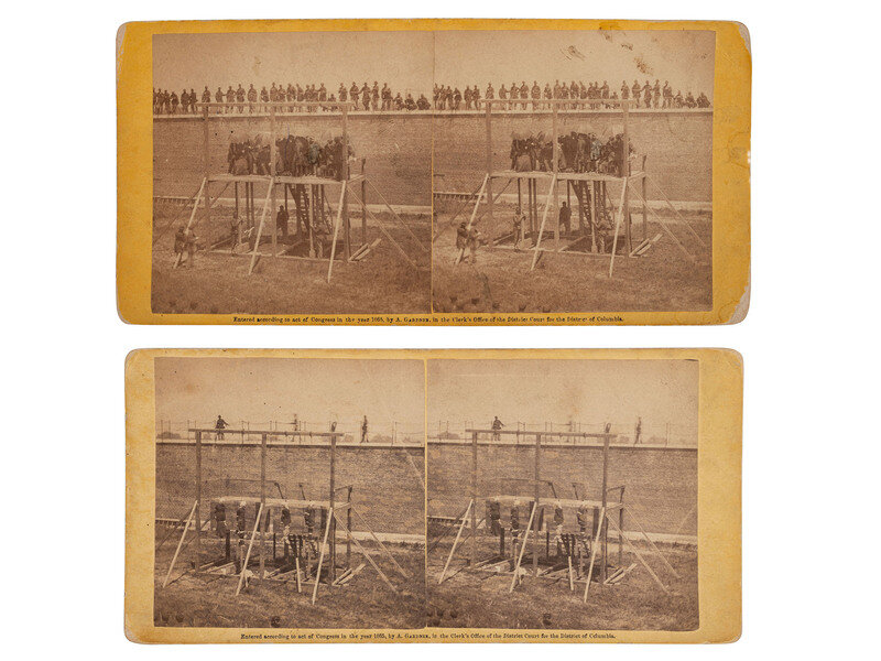 [LINCOLN ASSASSINATION]. GARDNER, Alexander (1821-1882), photographer. Pair of stereoviews of the Execution of the Conspirators. Washington: Philp & Solomons, ca 1865.