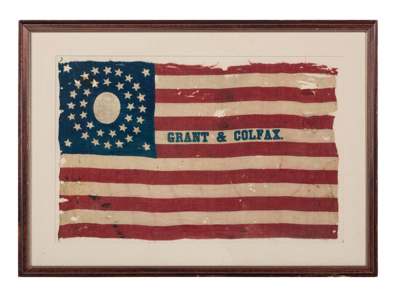 16 x 25 in. silk flag printed in red, white, and blue, 37 stars configured around a black and white portrait of U.S. Grant, which is based on a photo by Gutekunst and engraved by J.C. Buttre when Grant was a lieutenant general. Legend on white stripe, "Grant & Colfax." Matted and framed, 16 x 25 in.