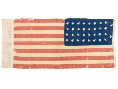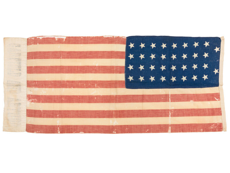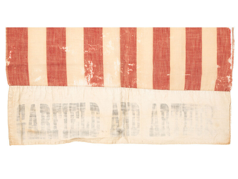 The 34-star flag was originally in use from 1861-1863, indicating that this is a repurposed example made in support of Republican nominees James Garfield and Chester Arthur for the 1880 presidential campaign.