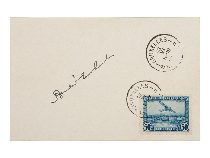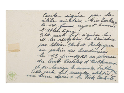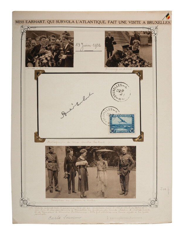 11.875" x 8.8". Lot consists of a former scrapbook page including three newspaper photographs and a postcard, the latter signed by Amelia Earhart. All labels are written in French, and include a bold pasted title reading MISS EARHART, QUI SURVOLA L'ATLANTIQUE, FAIT UNE VISIT A BRUXELLES. The three photographs are flanked by the date 1932 with the upper left one additionally marked "Arrivee a Haeren", and the upper right, "Hommage an Soldat inconnu" an appropriately depict Earhart before a podium and laying a wreath at the Belgian Tomb of the Unknown Soldier. The third photograph below shows Earhart and her husband, George Putnam, in the company of King Albert I and Queen Elisabeth of Belgium and labeled "Reception au Chateau de Laeken", the traditional home of Belgian royalty. The card itself is signed on one side with an explanation upon the other declaring that this card was signed during the reception of Earhart at the Aero Club de Belgique in the Palais Des Academies, home of the Belgian Royal Academy of Sciences