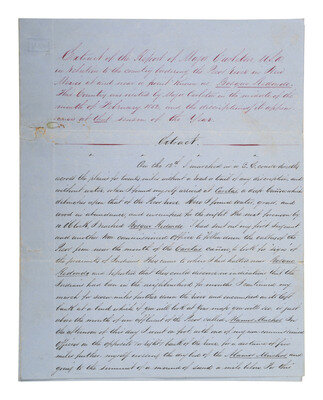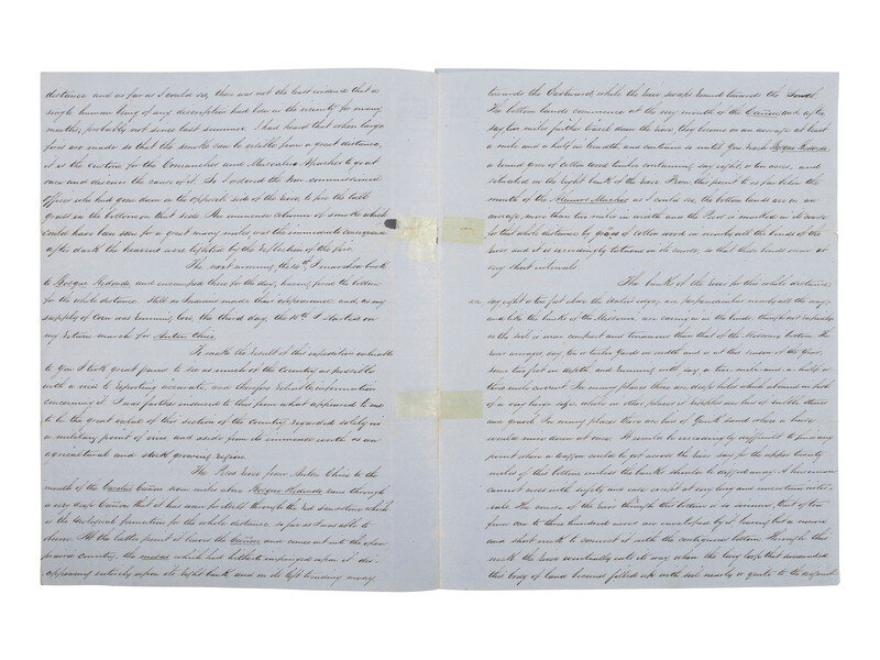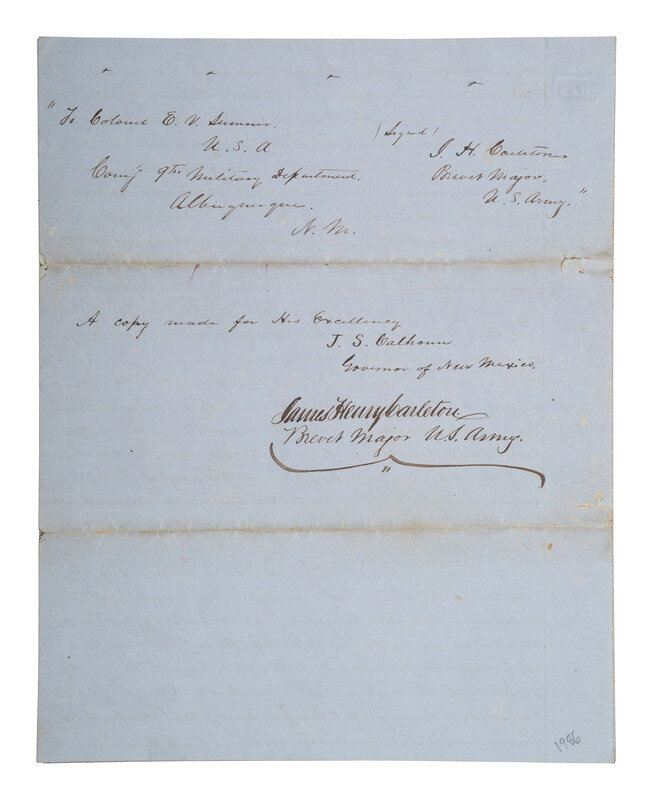 "Extract of the Report of Major Carleton USA in relation to the country bordering the Pecos River in New Mexico at and near a point known as Bosque Redondo. This Country was visited by Major Carleton in the middle of the month of February 1852, and the discriptions [sic] of it appearance at that season of the Year." 8pp, approx. 7 3/4 x 10 in. (creasing at folds, toning, adhesive repair, small losses not affecting text). Document in secretarial hand. Carleton signs ("James Henry Carlelton / Brevet Major U.S. Army") below notation "A copy made for His Excellency J.S. Calhoun / Governor of New Mexico." The original extract was submitted to Colonel E.V. Summer, Commanding 9th Military Department, Albuquerque, NM.