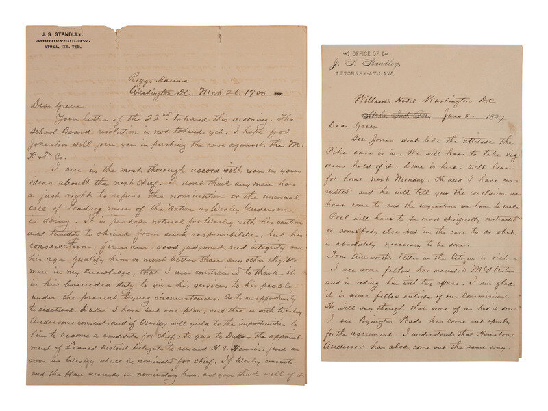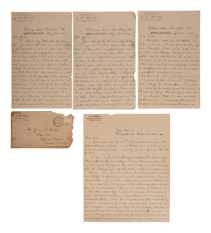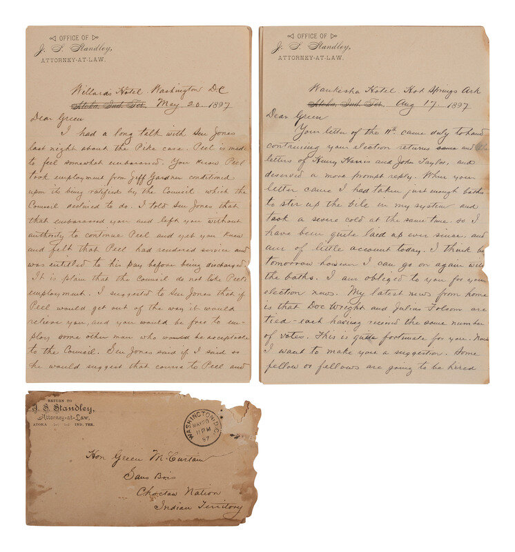 [NATIVE AMERICAN]. Letters from attorney and Confederate veteran James S. Standley to Chief Green McCurtain regarding Choctaw Nation politics.