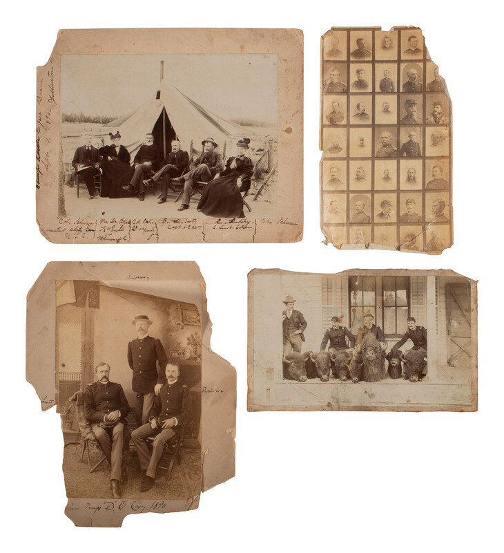 Studio portrait of George Lawson Scott with fellow officers of Troop D, 6th Cavalry, 1890 (significant wear to print and mount, including areas of loss). -- Outdoor view of Scott posed on a front porch with fellow officers (2). -- View of several officers, including Scott (second from right), posed with buffalo heads on a porch. This photo was taken following the capture of Edgar Howell in 1894. -- Outdoor camp scene, showing Scott seated in front of a tent with fellow officers and their wives at Yellowstone, September 1896. -- Composite image of more than 30 officers (damaged, with loss to top right and bottom right corners). -- Cabinet card of a young Kiowa woman.