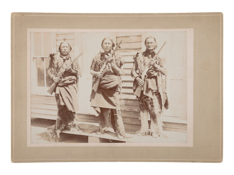 [NATIVE AMERICANS]. Cabinet card of Kiowa-Comanche Reservation leaders Silverhorn, Anko, and Comanche Jack. [Oklahoma, I.T.]: [Irwin], ca 1890s.