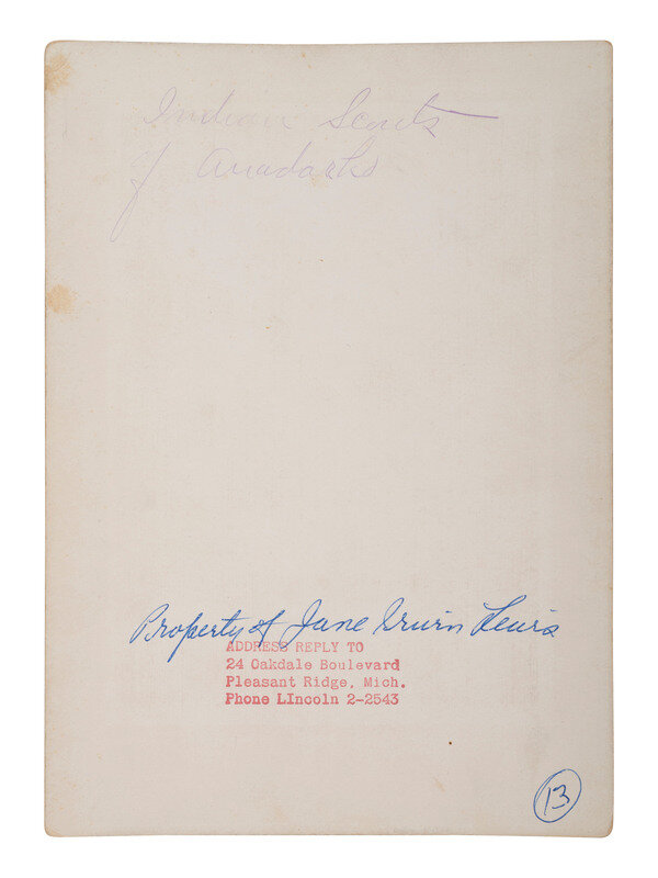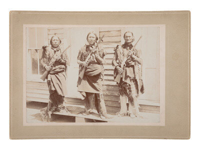 Cabinet photograph on cardstock mount of Comanche Jack (Watchymansookwat), Anko, and Silverhorn (Haungooah) as members of the tribal police at Anadarko Agency, Oklahoma Territory. The men are shown displaying their Winchester carbines. Lacking a studio imprint but known to have been taken by Irwin, ca 1890s.