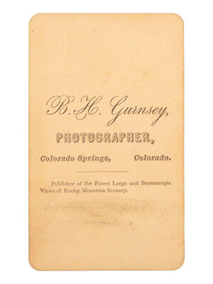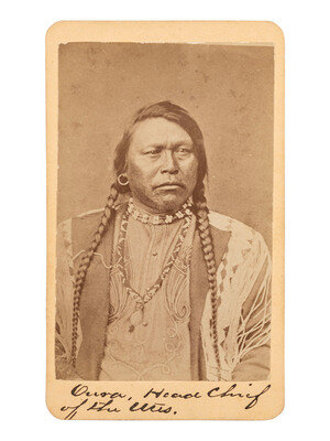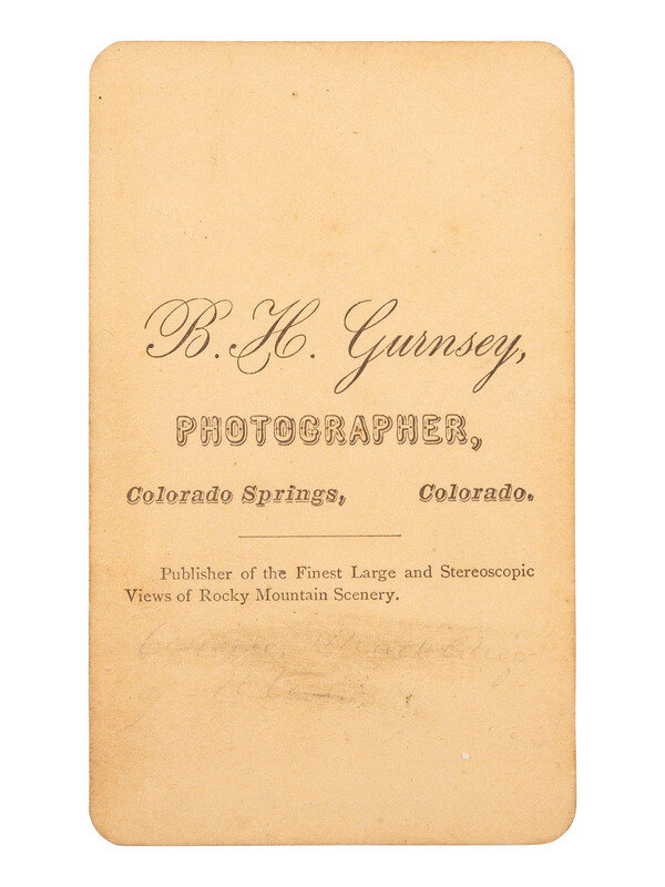 CDV on cardstock mount showing Ouray, or Arrow, Head Chief of the Uncompahgre Ute. Verso with Gurnsey's Colorado Springs, Colorado imprint, ca 1879. Ouray died the following year, while returning from a trip to Washington, DC.