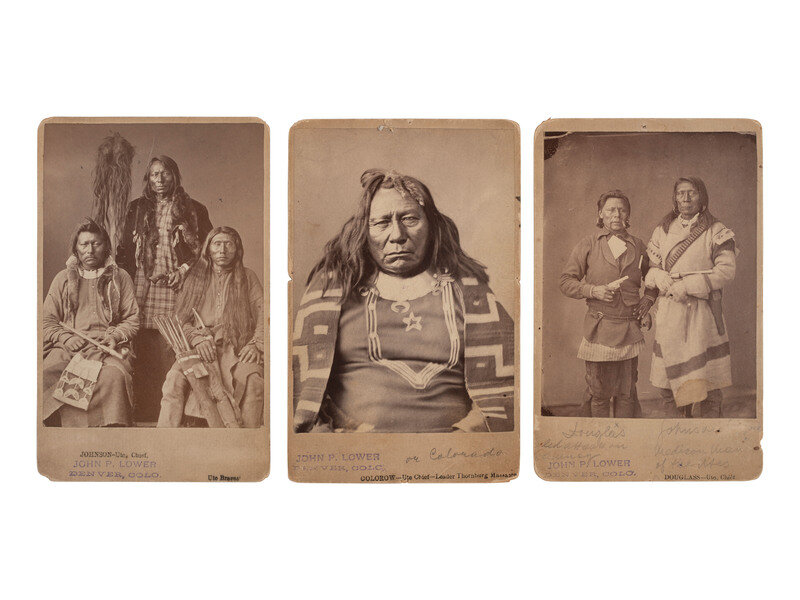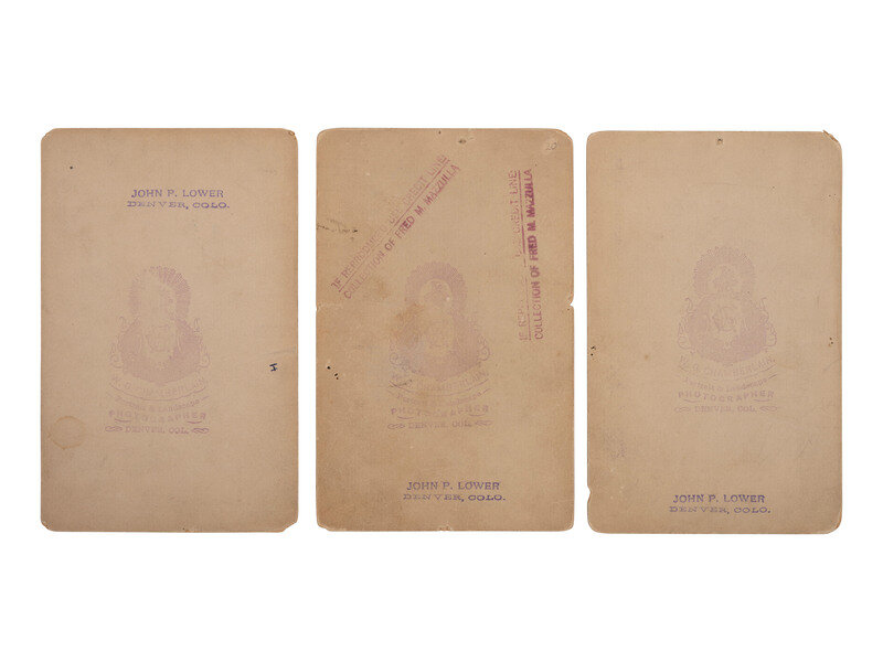 3 cabinet card portraits, each with W. G. Chamberlain's pictorial imprint on verso, printed subject identification on recto, and multiple ink stamps for John P. Lower, Denver, Colorado. Lower was a white gunsmith and dealer who developed a close relationship with many Utes in Denver.