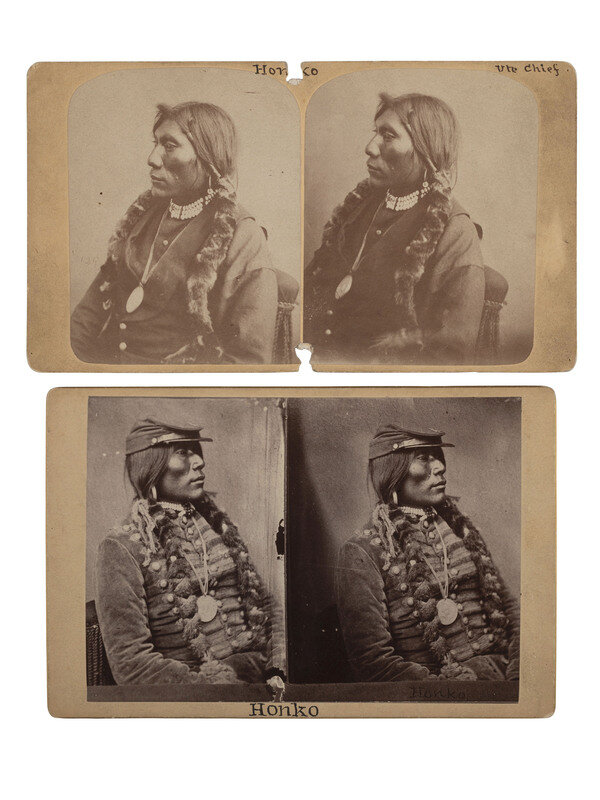 2 stereoviews on cardstock mounts showing Ute Chief Honkapkna, or Honko, including: A flat-mount stereoview of Honko wearing a kepi and military-style coat, identified in lower margin. Uncredited. -- Stereoview of Honko with fur wrapped around his long braids. Verso with imprint of "John P. Lower, Sportsmen's Depot, Denver, Colorado." Manuscript identifications on mount recto and verso.