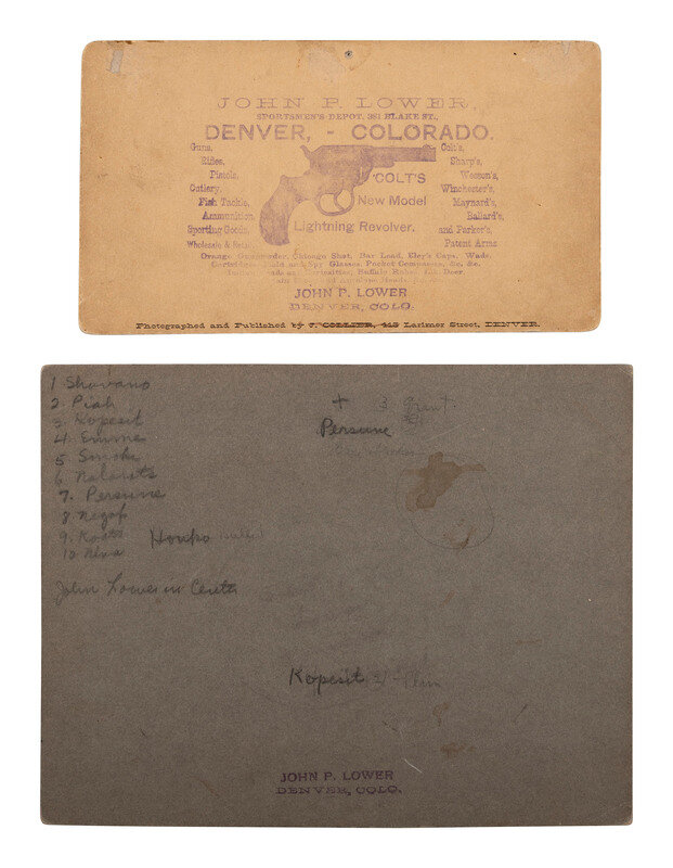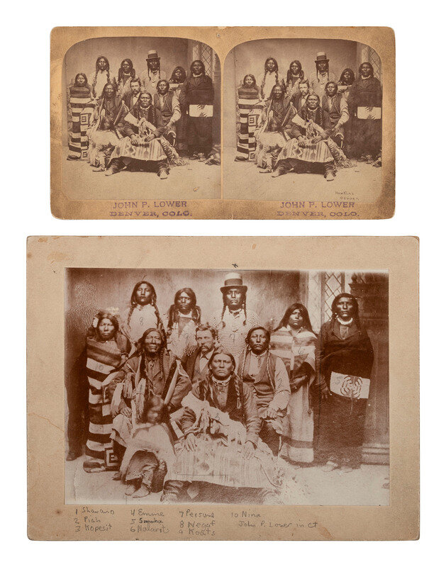 Includes: Stereoview on cardstock mount. With "Hawkins, Denver" written in the negative. Mount recto and verso with "John P. Lower, Denver, Colorado" ink stamps. Additional imprint of photographer and publisher J. Collier, Denver, on mount verso. -- 4 3/4 x 6 1/2 in. photographic enlargement of the group portrait on cardstock mount with manuscript identifications. In addition to John P. Lower, who is seated near the center, subjects include Shavano, Piah, Kopesit, Naleratz, Smoke, Negaff, and others.