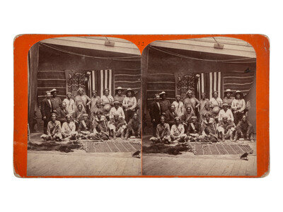 Stereoview on cardstock mount showing a group of Navajo Indians posed with samples of their weavings. Two white men pose with the group. Verso with applied paper label including series title, photographer's credit, and caption.