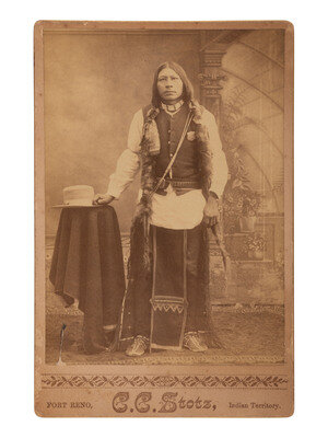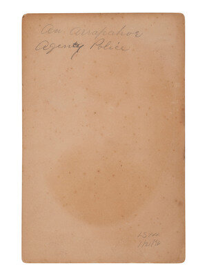 Cabinet photograph on cardstock mount featuring a full-standing portrait of an Arapahoe Agency police officer, as identified on mount verso. With Stotz's Fort Reno, Indian Territory imprint on mount recto. Another example of this portrait located online identifies the Arapahoe subject as "Yellow Man."