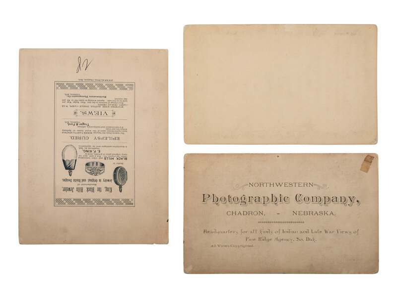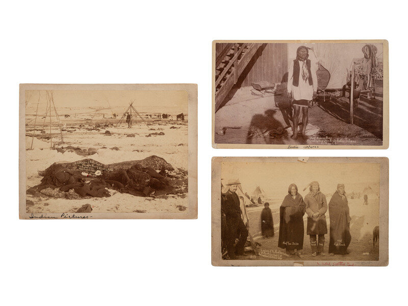 Birds Eye View of Battlefield at Wounded Knee, S.D. looking North. 5 3/4 x 7 1/2 in. photograph on cardstock mount. -- Leaders of the Hostile Indians at Pine Ridge Agcy, S.D. During the late Sioux War. Includes Chief Two Strike, Chief Crow Dog, and Chief High Hawk. 4 1/2 x 7 1/2 in. photograph on cardstock mount. -- Chief Kicking Bear. A leading Chief of the Brule Hostile Indians, Pine Ridge, S.D. Uncredited, but likely printed by the Northwestern Photographic Co. 4 3/4 x 8 in. photograph on cardstock mount.