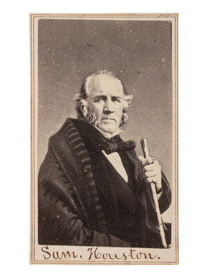 [TEXAS -- HOUSTON, Sam (1793-1863)]. CDV of General Houston seated with cane. New York: C. D. Fredricks & Co., ca 1860.