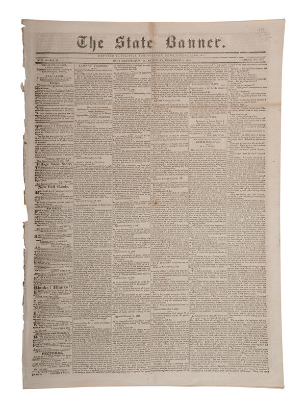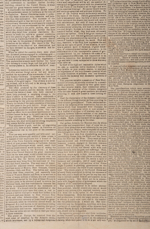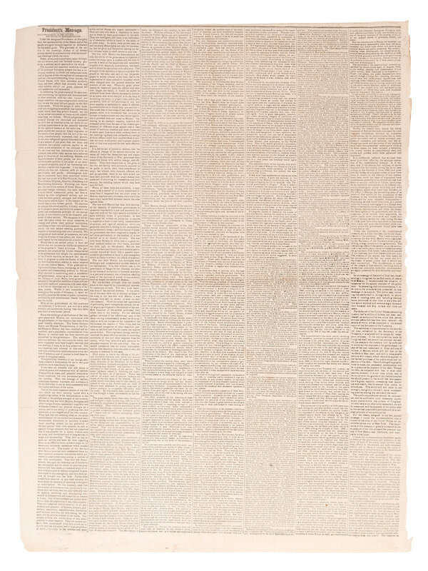 A broadsheet supplement “extra” to The State Banner (Bennington, VT) dated 2 December 1848, containing James K. Polk's State of the Union address, delivered days earlier, in which he announces the discovery of gold in California.