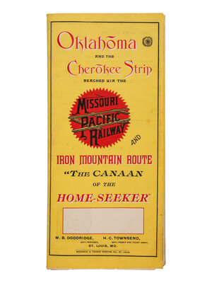 Color map, 20 3/4 x 14 1/2 in. from neat line to neat line, within printed pamphlet, approx. 3 3/4 x 8 1/4 in. when folded, containing 14pp of text under headings including "Public Land Laws," "The Cherokee Strip," "How to Reach the Promised Land and Where to Outfit," and "How to Locate Your Land." Areas of the map shaded in red indicate "Lands designated in the Peel Bill and to be opened for settlement by the President's Proclamation." Yellow shaded areas indicate "Oklahoma Territory Lands, now open for settlement." Pink shaded areas indicate Indian Territory, "Lands not opened for settlement." Copyrighted by H.C. Townsend, General Passenger and Ticket Agent, Missouri Pacific Railway Company.