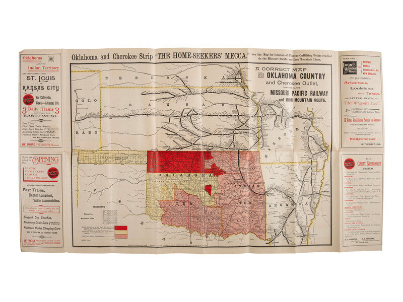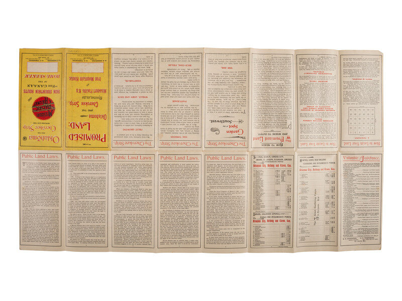 The 1889 Indian Appropriations Act officially opened the Unassigned Lands of Indian Territory to non-native settlers under tenets of the Homestead Act, culminating in the Oklahoma Land Run of 1889. This rare early promotional map of the Oklahoma Territory including the Cherokee Strip and contiguous regions, shows the routes to the Territory serviced by the Missouri Pacific Railway and Iron Mountain Routes, and discusses at length public land laws, how to stake a claim, and the virtues of the Cherokee Strip.