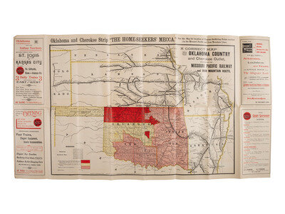 [MAPS -- OKLAHOMA LAND RUSH]. Oklahoma And The Cherokee Strip Reached Via The Missouri Pacific Railway And Iron Mountain Route “The Canaan Of The Home-Seeker.” St. Louis, MO: Woodward & Tiernan Printing Co., 1889.