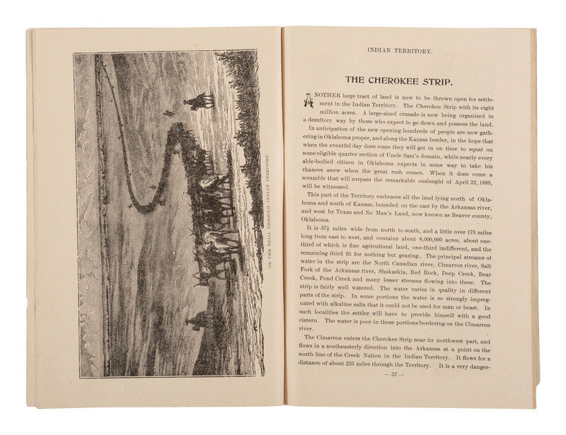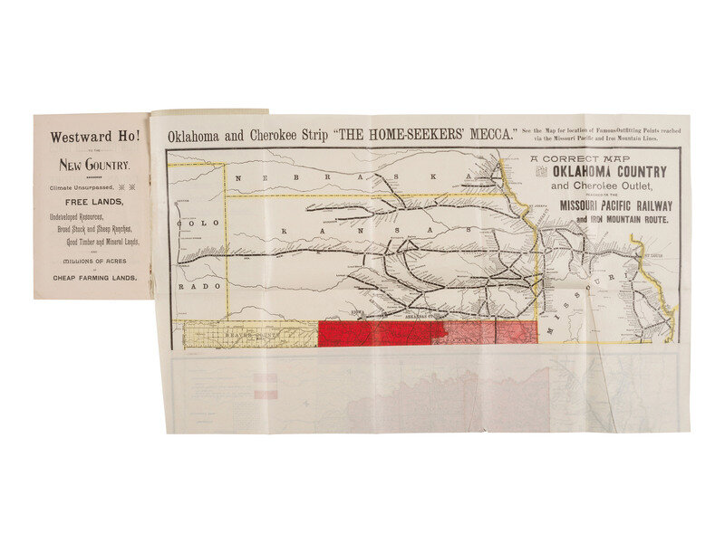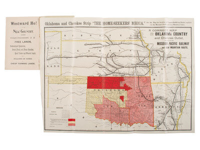 Rare promotional booklet issued by the Missouri Pacific Railway Company for homesteaders who were preparing to embark for the Cherokee Strip. 5 1/4 x 7 1/2 in., printed paper wrappers with cover title "Indian Territory, Oklahoma and the Cherokee Strip." Second Edition. 85pp, with advertisements and large folding map (penciled initials on top right corner of front wrapper, loss to bottom left corner of rear wrapper, light toning, pages clean). Color map adhered to interior of rear wrapper, "A Correct Map of the Oklahoma Country and Cherokee Outlet, Reached via the Missouri Pacific Railway and Iron Mountain Route." 20 3/4 x 14 1/2 in. from neat line to neat line. St. Louis, MO: Woodward & Tiernan Printing Co., likely a reissue of an 1889 map that appeared in a Missouri Pacific printed promotional pamphlet of that date.