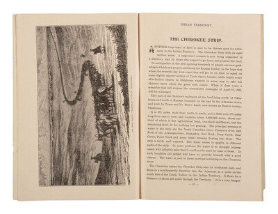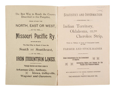 The 1889 Indian Appropriations Act officially opened the Unassigned Lands of Indian Territory to non-native settlers under tenets of the Homestead Act, culminating in the Oklahoma Land Run of 1889 and later the Land Run of 1893, or the "Cherokee Strip Land Run." This rare early promotional map of the Oklahoma Territory including the Cherokee Strip and contiguous regions, shows the routes to the Territory serviced by the Missouri Pacific Railway and Iron Mountain Routes, and contains information that would be deemed usable for potential settlers: historical background, details related to various Native American tribes, soil and crop analysis, and more. Like earlier, related imprints by the Missouri Pacific Railway Company, this publication was likely timed to coincide with the opening of the Cherokee Strip in 1893, the Oklahoma Territory's fourth and largest land run.