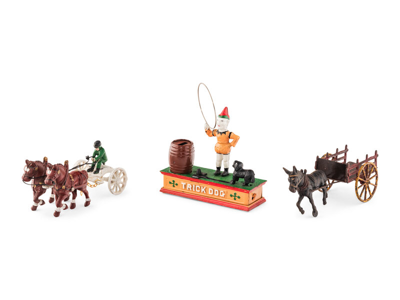 Includes sulkey, a donkey and cart. and a trick dog bank.