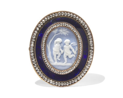 A Brass, Guilloché Enamel and Marcasite Brooch with Inset Wedgwood Jasperware Cameo Buckle