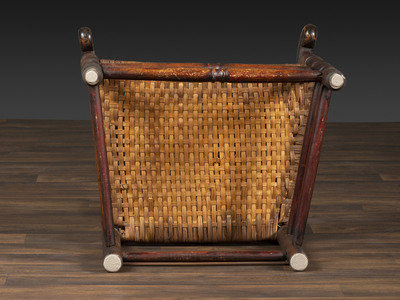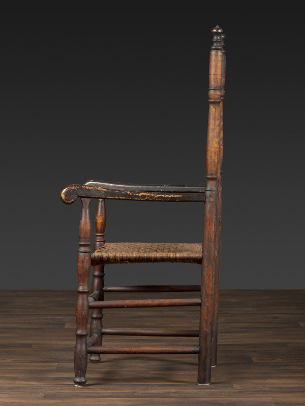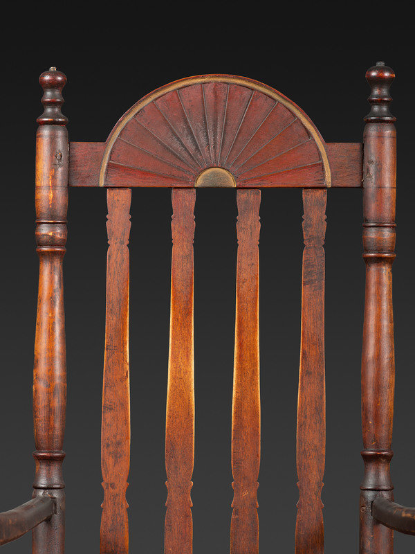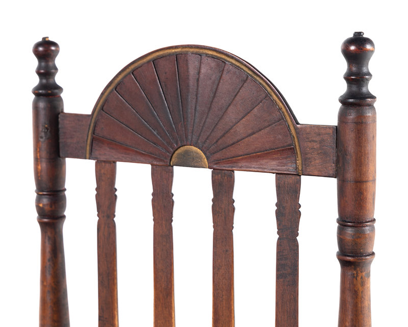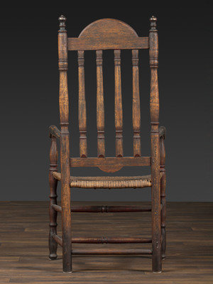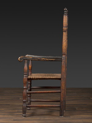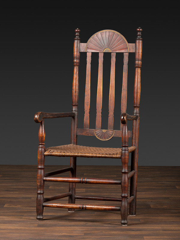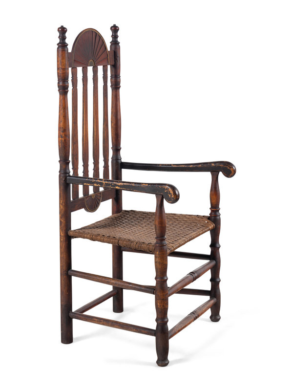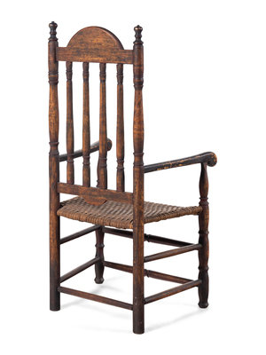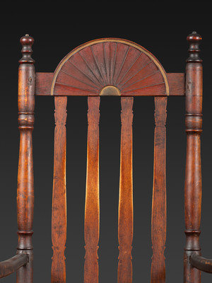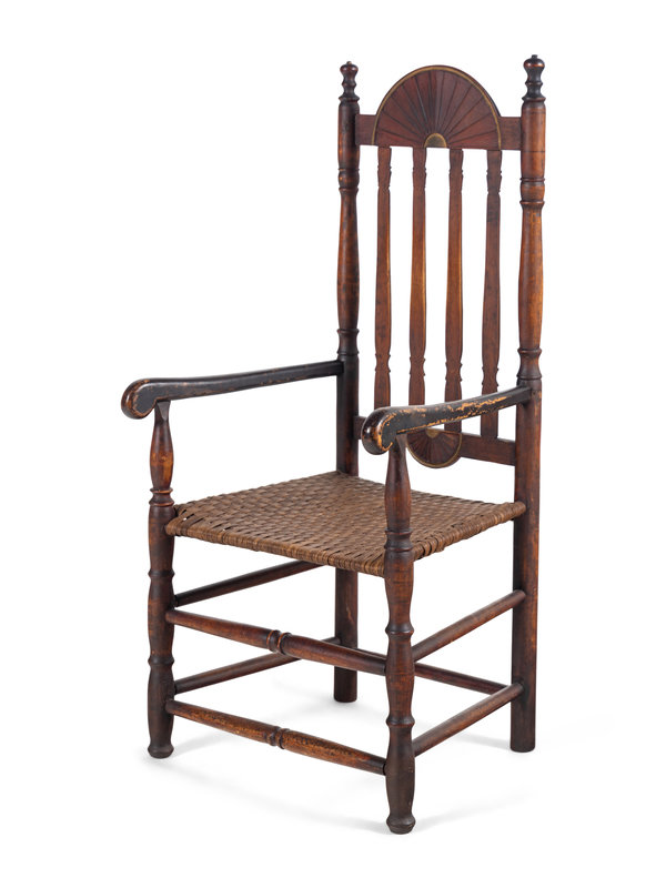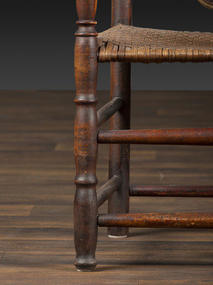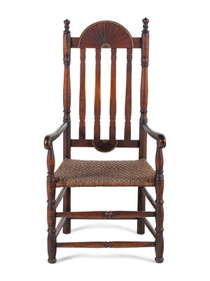 A William and Mary Style Parcel Gilt and Red Painted, Fan-Carved Bannister Back Woven Splint Seat Armchair