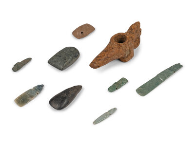 Eight Costa Rican Jade Celts and Pendants and a Costa Rican Stone Zoomorphic Mace Head