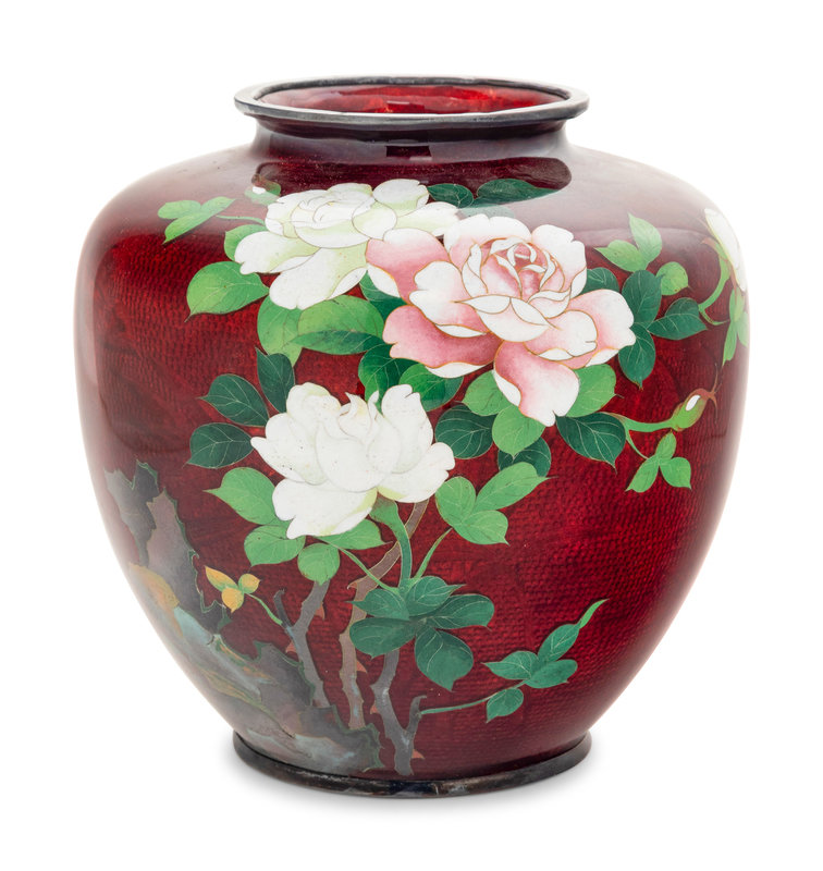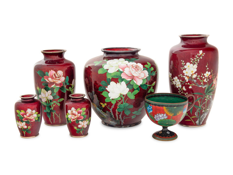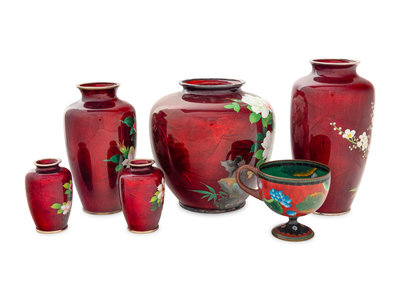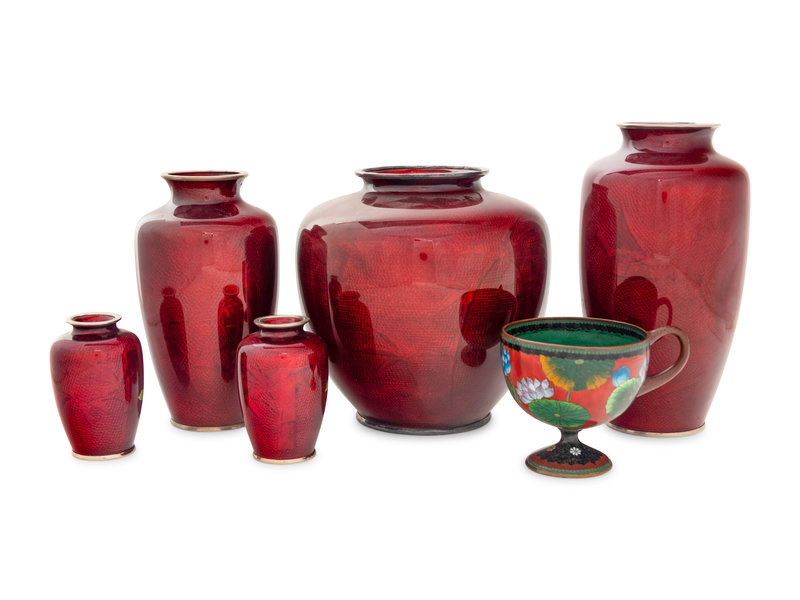 A Group of Six Japanese Red Ground Cloisonné Vessels