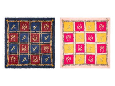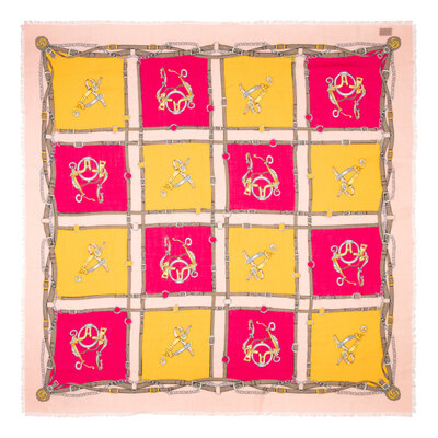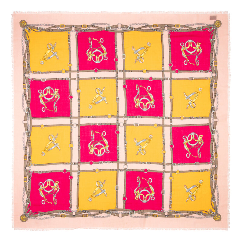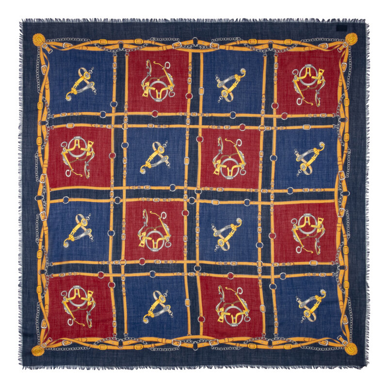 52" x 52" shawl in printed wool voile depicting equestrian tack on a multicolor background. Unfinished/frayed edges.