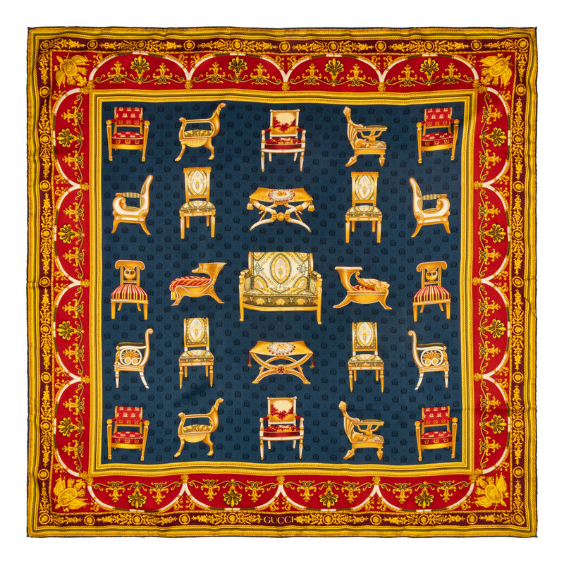 34" x 34" scarf in printed silk twill depicting chairs on an ornate multicolor background. Hand-rolled and stitched edges.